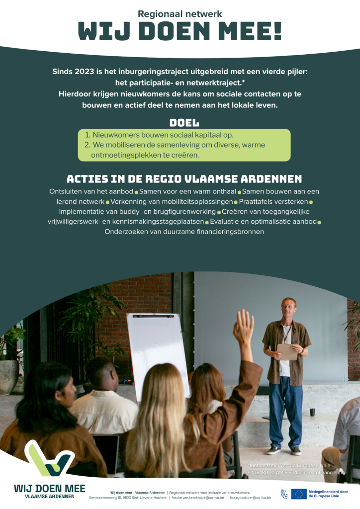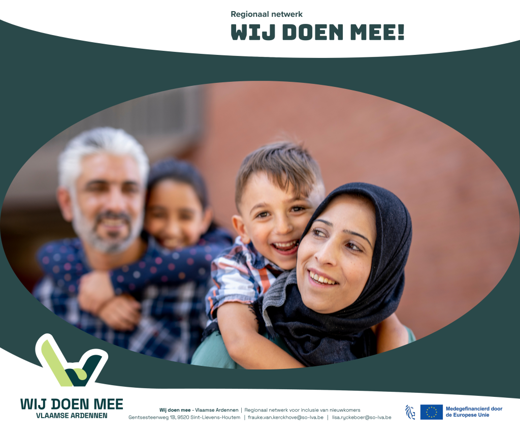 ‘Wij Doen Mee – Vlaamse Ardennen’ is een regionaal samenwerkingsverband van lokale besturen, het Agentschap Integratie en Inburgering (AgII) en een brede mix van organisaties, verenigingen, bedrijven en burgers. Onder het motto ‘Samen is beter’ bundelen we onze krachten zodat nieuwkomers vlot hun weg vinden naar het sociale leven in onze regio en hun sociaal netwerk kunnen uitbouwen.