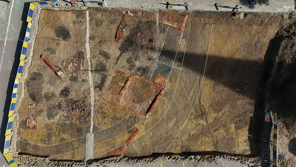 Afbeelding hierboven: Middeleeuwse kuil met een fragment van een tuitpot in Rijnlands roodbeschilderd aardewerk.