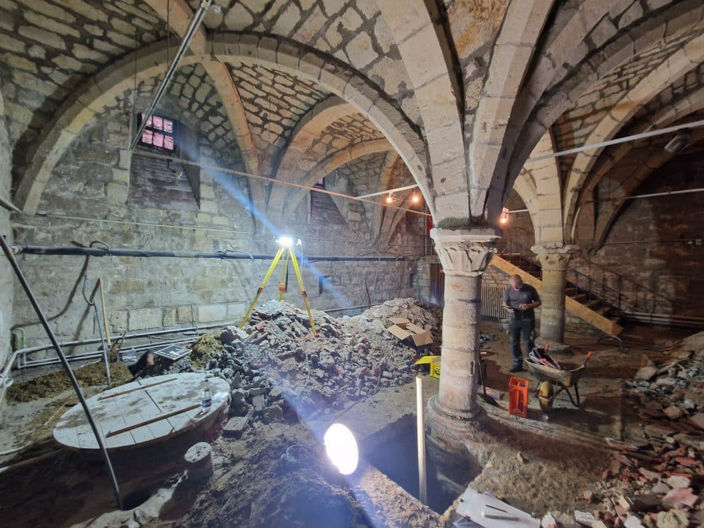 Nadien volgde een proefputtenonderzoek in de kelderruimte om de verwachting te toetsen. Het onderzoek wees uit dat de oorspronkelijke bodemopbouw onder het huidige vloerniveau niet meer aanwezig is. Onder een betonnen fundering kwamen verstoorde lagen voor, met daaronder onmiddellijk de natuurlijke ondergrond. Archeologisch relevante lagen, sporen of structuren werden niet vastgesteld; enkel de fundering/zuilbasis van een dragende zuil werd gedocumenteerd. Op basis van deze resultaten is geen verder archeologisch onderzoek nodig.