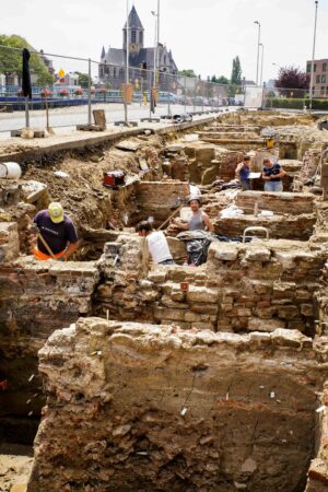 Op deze plaats bevond zich één van de oudste straten van Oudenaarde. Het onderzoek leverde sporen op van de 12de eeuw tot de 20ste eeuw. De sporen uit de 12de eeuw bestaan uit een sequentie van lemen vloeren, die horen bij houten woningen. Ze bevinden zich bovenop een ophoging die mogelijk in verband te brengen is met het uitgraven van de Schelde. Verschillende muren in Doornikse kalksteen en enkele fragmentarisch bewaarde stukken vloer in Doornikse kalksteen wijzen samen met een gebouw in baksteen op de aanwezigheid van zogenaamde ‘stenen’ in de 13de eeuw.