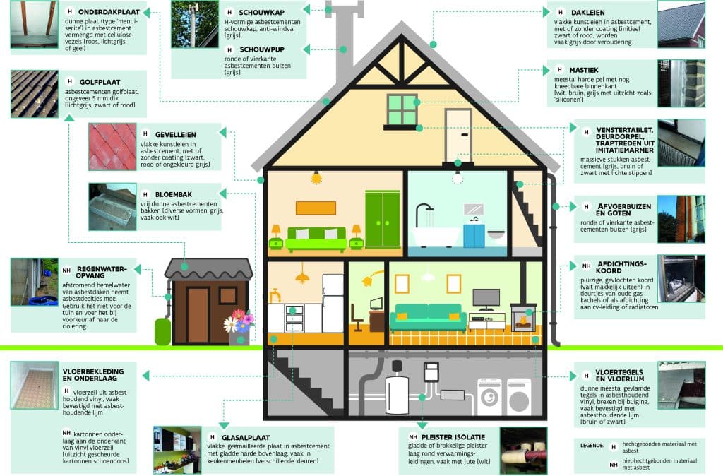 Asbest kan voorkomen in meer dan 3.500 toepassingen – veel meer dan alleen de bekende golfplaten. Enkele voorbeelden: